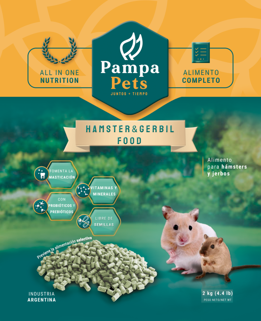 al bienestar de tu mascota. Pampa Pets® HAMSTER & GERBIL FOOD al ser un alimento ALL IN ONE (todo en uno) evita la alimentación selectiva de granos y semillas, que producen desequilibrios nutricionales. Aporta proteínas, vitaminas, minerales, ácidos grasos, probióticos, para mantener saludable y llena de vitalidad a tu mascota.