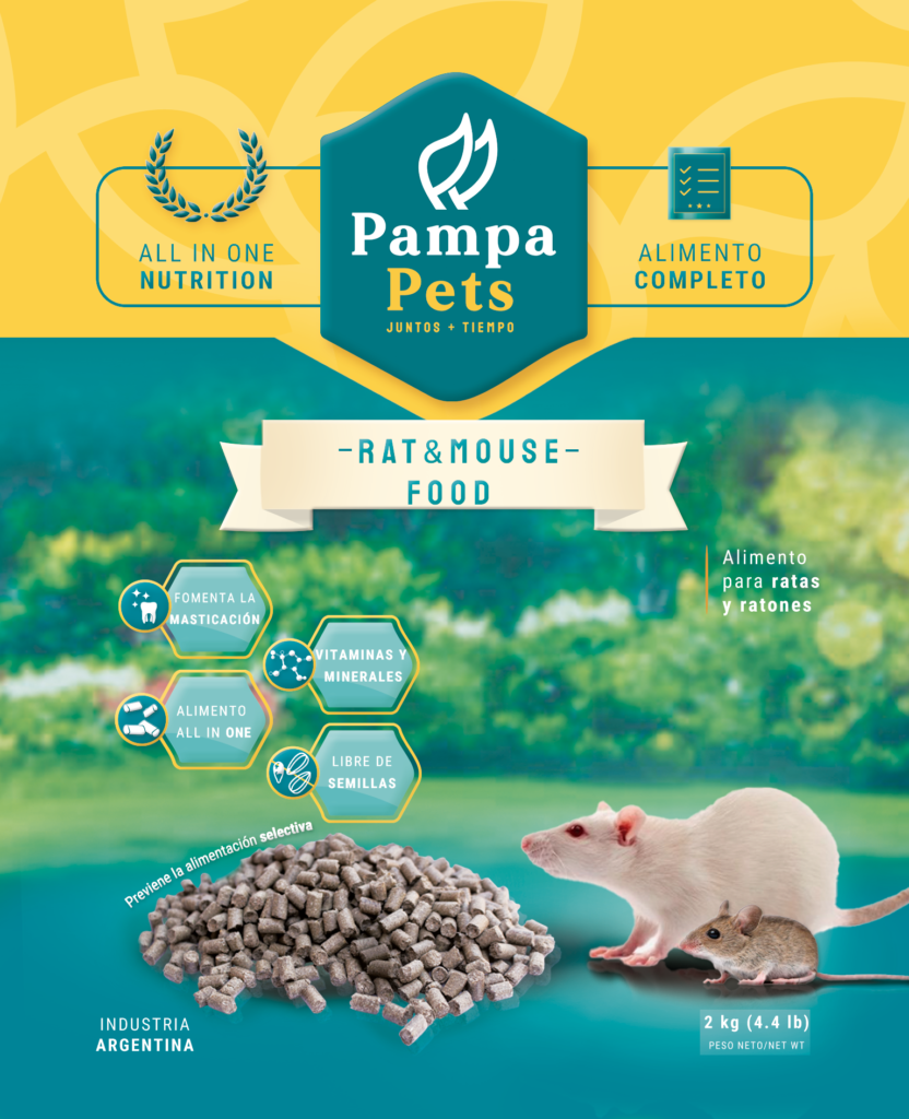 Pampa Pets® RAT & MOUSE FOOD, constituye un alimento a base de pellets, del tamaño adecuado para roer y favorecer el desgaste dentario. Además, combina todos los ingredientes nutritivos y saludables que contribuyen al bienestar de tu mascota. Pampa Pets® RAT & MOUSE FOOD al ser un alimento ALL IN ONE (todo en uno), evita la alimentación selectiva de granos y semillas, que produce desequilibrios nutricionales. Aporta proteínas, vitaminas, minerales, ácidos grasos, probióticos, para mantener saludable y llena de vitalidad a tu mascota.